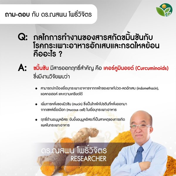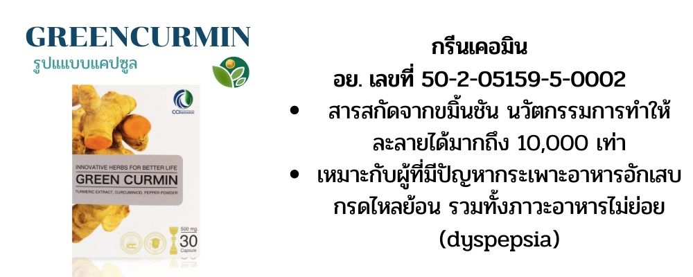 สารเคอร์คูมีนอยด์ (Curcuminiods) สกัดจากขมิ้นชัน สามารถช่วยในเรื่องปัญหากระเพาะอาหารอักเสบ รวมทั้งภาวะอาหารไม่ย่อย (dyspepsia) ทางเลือกใหม่ สมุนไพรไทย ปลอดภัย ได้รับการรับรองจาก กระทรวงสาธารณสุข อย. สำหรับผู้ที่เป็นกรดไหลย้อน ชนิดเรื้อรัง ไม่หายสักที ต้องลอง!!!
